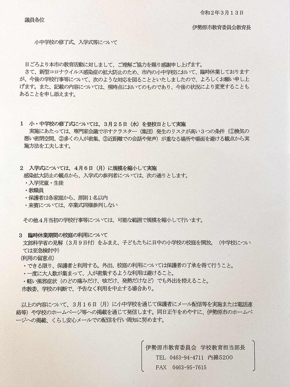 教育委員会より、小中学校の修了式や入学式についての方針。